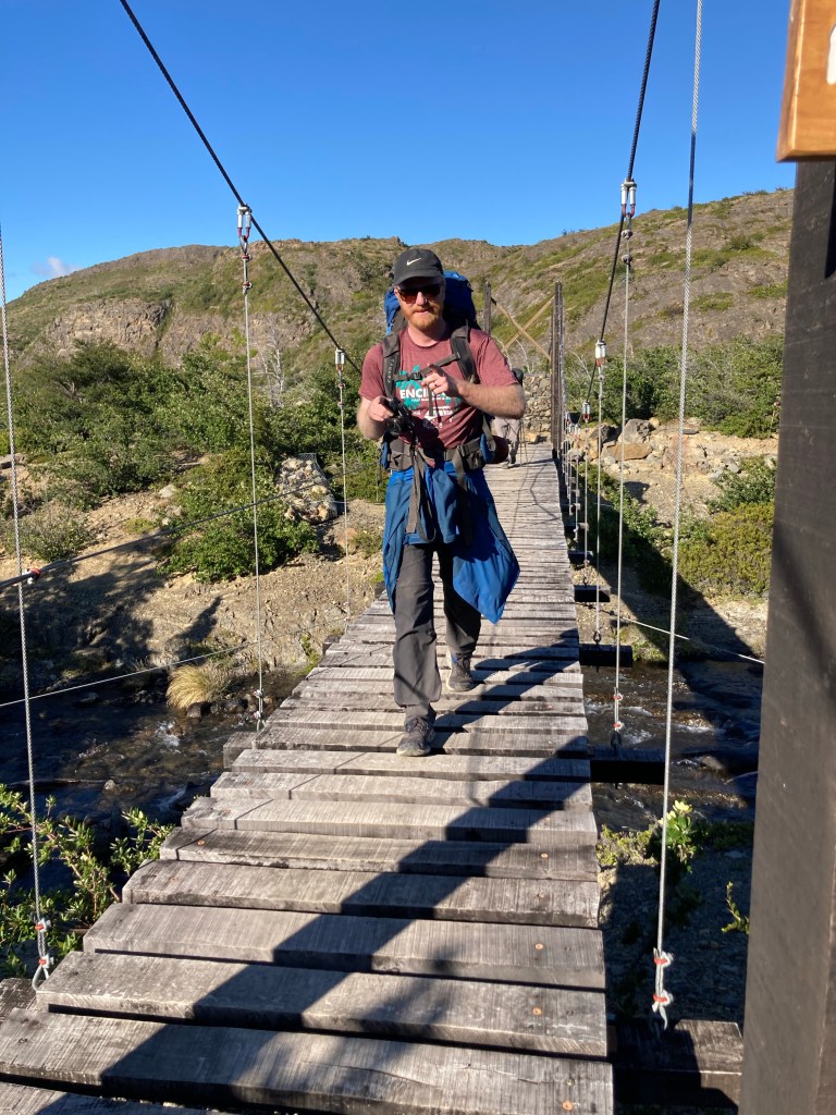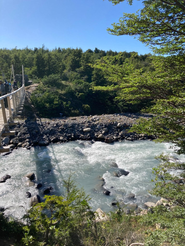 This was when we realized we couldn’t really listen to the trail markers as their distances seemed to be off. One said we were only 1.8km from the outlook, however, it seemed to be closer 2.5km. By the end of the trek we realized almost every hiker had the same realization that they didn’t trust distances on signs the whole way. Getting up to the top was another climb through some boulders but once there offered an almost 320 degree view of the surrounding mountains around us. And of course was a hit spot for those “Instagram shots”. We sat at the top and admired the scenery a bit before taking our own pictures and heading back down. As we started to work our way down, we dunked our water bottles into a stream to refill on fresh glacier water – this is one amazing part of Patagonia in that nowhere on the entire mountain do you need to filter water!