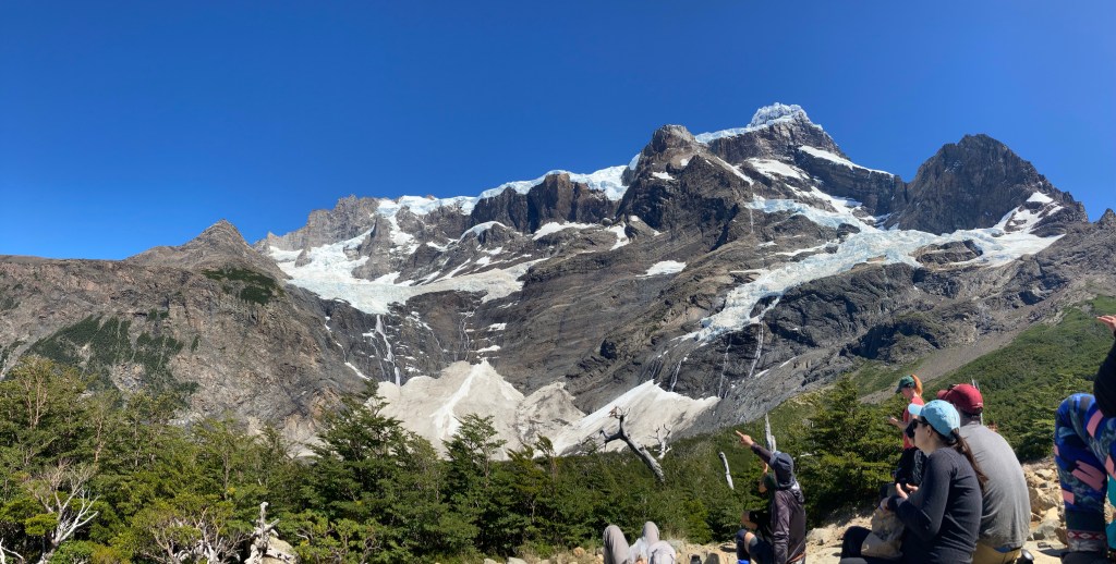 After reaching Camp Italiano, we grabbed some snacks to refuel and refilled our water bottles before heading up to Mirador Britanico. The trail had quite the terrain varying between a rocky path with several boulders to climb over or through along with a dirt trail through a valley of trees. The first viewpoint was Mirador Francis which offered us the opportunity to hear the cracking of the glacier ice and some small avalanches. The video below shows a bigger one Grant was able to catch on camera as we were headed back down the trail. Upon close inspection of the glacier we could see numerous pathways of running water not quite powerful enough to call waterfalls but amazing in how the water melt was enough to create small streams that flowed underneath the ice at the bottom.