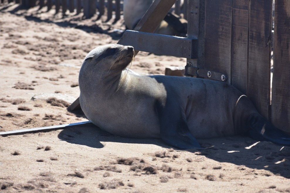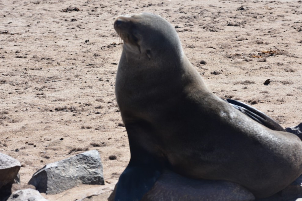 When we finally made it to Cape Cross, we stopped by the visitors center to pay our entrance fees and get a map of the seal reserve. We weren’t sure what we expected to see while driving along the road to the seal reserve. However, we were hit with the smell first of a thousand plus seals and could see hundreds of seals by the pedestrian walkway. There were even a few by the entrance gates to the walkway, so I was nervous about going close to the gate. There are plenty of signs and comments to avoid getting too close to them as they could attack and bite. We’ve done pretty well to prevent any injury, and I wanted to keep it that way. Grant was able to hop onto the walkway from the side and shoo the seals away from the gate so I could get in.