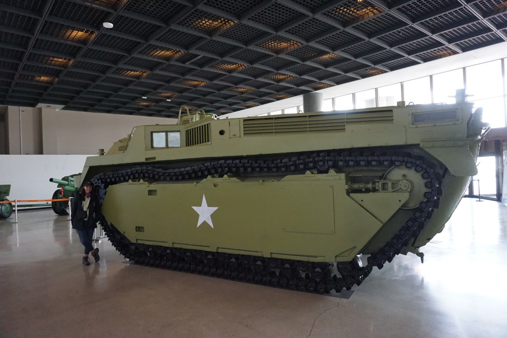 They had several military vehicles on the bottom floor of the museum and as well as outside. We realized after walking through that a lot of military equipment given to South Korea was done by the US while Russia and China supplied the North with most of their equipment. The museum noted that most of the old Soviet equipment is still in use by North Korea. In our DMZ tour earlier in the week Grant had asked our guide what happened to companies that had offices on either side of the DMZ and he noted both countries were poor and ravaged at the time and had no major companies. The country was so decimated by Japan in the early 1900’s (annexed by Japan in 1910), then after World War II the North/South divide was created in 1945 by the Allied countries and just 5 years later the country was at war again (the Korean War). When the Korean War started, North Korea (backed by Soviets and China) captured Seoul in just three days. The United States immediately acted, along with various UN counterparts, to help push them back North and the fight basically stale-mated for 2-3 years as the superpower countries helped pump more and more equipment, training, personnel, etc. into both sides. You can see in many of the pictures below the major equipment still has USA insignia. There were also a number of modern vehicles that proudly displayed “designed and made in Korea.”