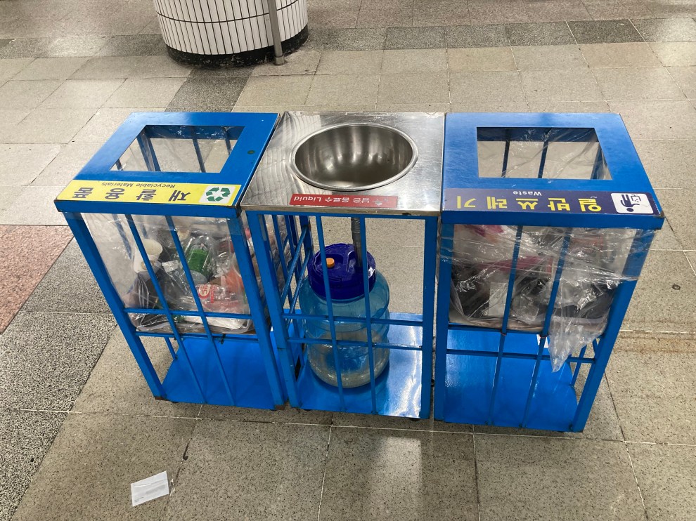 On topic of waste … we noticed many waste bins had a center section to pour out any remaining liquids before recycling a can or bottle.